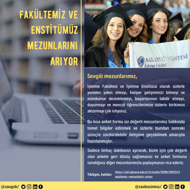 İşletme Fakültesi ve İşletme Enstitüsü olarak sizlerle yeniden yakın olmayı, kariyer gelişiminizi bilmeyi ve mümkünse desteklemeyi, başarılarınızı takdir etmeyi, duyurmayı ve mevcut öğrencilerimize sizlerin birikimini aktarmayı çok istiyoruz.