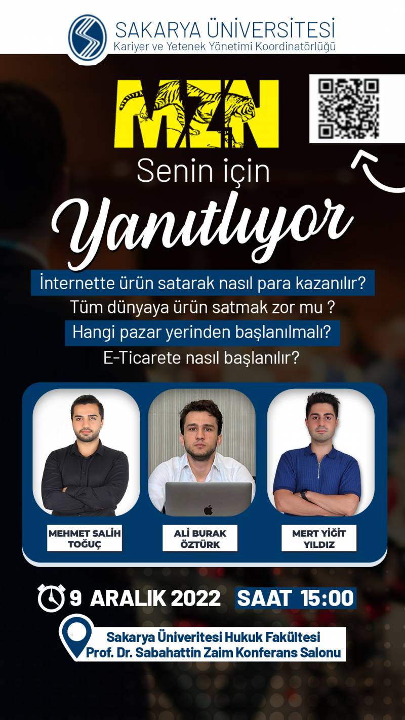 Sakarya Üniversitesi Kariyer ve Yetenek Yönetimi Koordinatörlüğü tarafından düzenlenen, E-Ticaret ve Amazon danışmanlık, iş geliştirme ve pazarlama danışmanlığı firması olan MZN Danışmanlık firması yetkililerinin iş planları ve E-ticarette yapılması gerekenler hakkında deneyimlerini aktaracakları etkinlik 9 Aralık Cuma günü saat 15.00'da Hukuk Fakültesi Prof. Dr. Sabahattin Zaim Konferans Salonunda gerçekleştirilecektir.