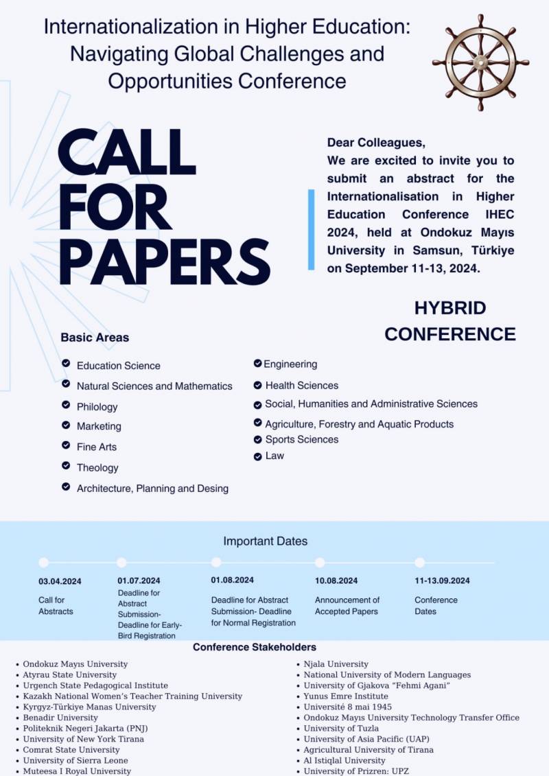 Ondokuz Mayıs Üniversitesi’nin (OMÜ)’ davetlisi olarak farklı ülkelerdeki üniversitelerin katılımıyla "Internationalization in Higher Education: Navigating Global Challenges and Opportunities" (IHEC.OMU-2024) başlıklı uluslararası bir konferans düzenlenecektir. Disiplinler arası bir içerikle hazırlanan Konferans Ondokuz Mayıs Üniversitesinin ev sahipliğinde 25-27 Ekim 2024 tarihinde İngilizce, yüz yüze ve çevrimiçi bir akışla gerçekleştirilecektir.