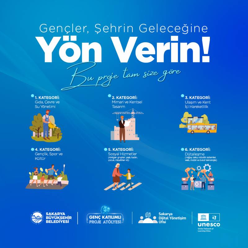 Çalışmaya katılanlar, "Gıda, Çevre ve Su Yönetimi", "Mimari ve Kentsel Tasarım", "Ulaşım ve Kent İçi Hareketlilik", "Gençlik, Spor ve Kültür", "Sosyal Hizmetler" ve "Dijitalleşme" olmak üzere toplam 6 farklı kategoride istedikleri takdirde birden fazla proje sunabilecektir.