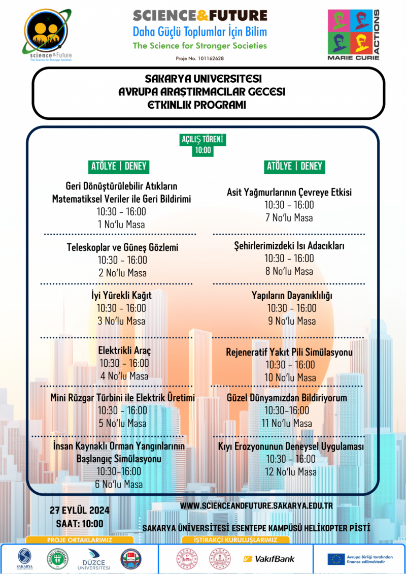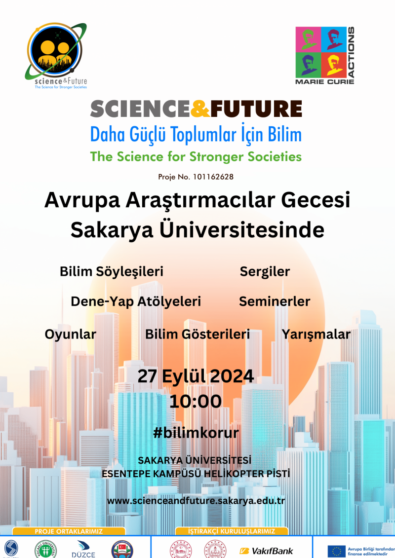 Üniversitemizin koordinatörlüğünde yürütülen Daha Güçlü Toplumlar için Bilim (SCIENCE&FUTURE) adlı projemiz kapsamında, 27 Eylül Cuma günü saat 10.00 - 20.00 saatleri arasında Avrupa Araştırmacılar Gecesi etkinliği düzenlenecek.