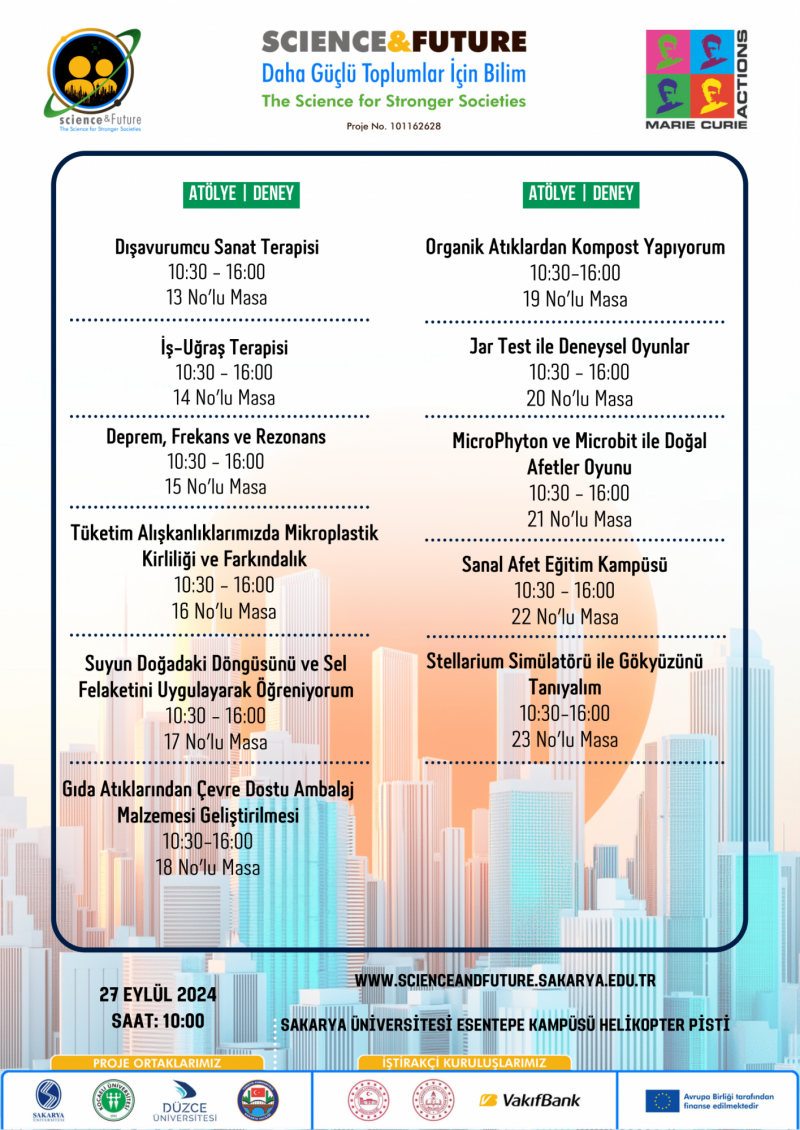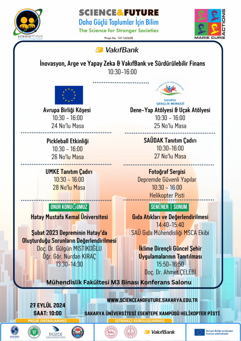 Geleceğin bilim insanlarına ilham kaynağı olacak ve toplumun her kesimine bilimi sevdirecek etkinliklerde buluşmak üzere sizleri SAÜ Helikopter Pisti'nde buluşmaya davet ediyoruz.