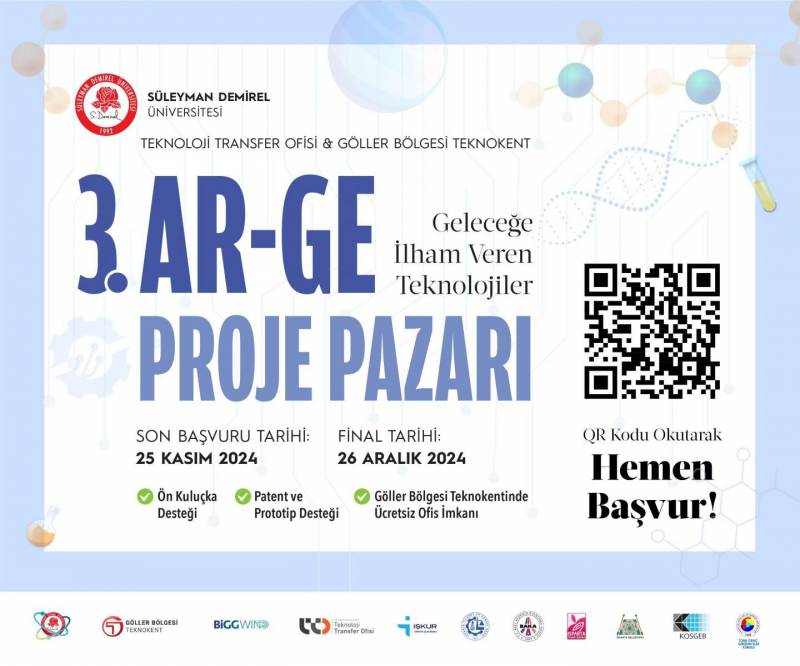 Süleyman Demirel Üniversitesi tarafından Göller Bölgesi Teknokent işbirliği ile düzenlenecek olan SDÜ 3. ARGE Proje Pazarı, TÜBİTAK 1503 Proje Pazarı Destekleme Programı kapsamında destek almaya hak kazanmıştır. Bu önemli destek, etkinliğin ülkemizin Milli Teknoloji Hamlesi doğrultusunda, inovasyon ve girişimcilik ekosistemine katkı sağlaması açısından büyük bir fırsat sunmaktadır. Söz konusu etkinlik, üniversite-sanayi iş birliğini güçlendirmeyi, teknoloji ve yenilik odaklı projelerin ticarileşme süreçlerini hızlandırmayı ve katma değer yaratma potansiyeline sahip projeleri desteklemeyi hedeflemektedir. Proje Pazarı’nda dereceye giren ilk üç proje ödüllendirilecek olup, tüm üniversitelerden akademisyen, öğrenci ve araştırmacılar projeleriyle başvuruda bulunmaya davet edilmektedir.Bu etkinlik kapsamında, Isparta Ticaret ve Sanayi Odası, Isparta Ticaret Borsası, Batı Akdeniz Kalkınma Ajansı (BAKA), Isparta Belediyesi, KOSGEB ve İŞKUR gibi saygın kurumlar iş birliği yapmaktadır.