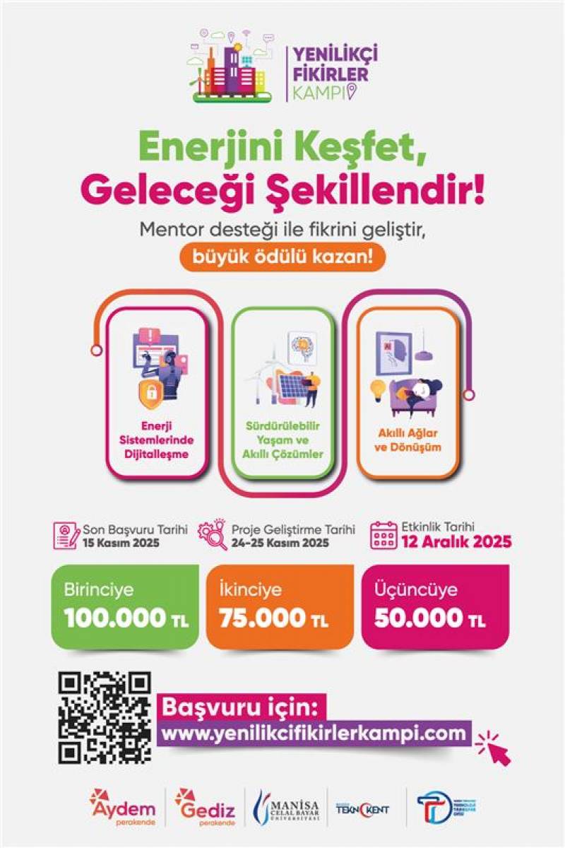 Manisa Celal Bayar Üniversitesi, Manisa Teknokent ve Teknoloji Transfer Ofisi katkılarıyla düzenlenen "Yenilikçi Fikirler Kampı" başvuruları başlamıştır. Etkinlik; Enerji Sistemlerinde Dijitalleşme, Sürdürülebilir Yaşam ve Akıllı Çözümler, Akıllı Ağlar ve Dönüşüm temalarında gerçekleştirilecek olup; katılımcılar mentor desteğiyle fikirlerini geliştirme fırsatı bulurken dereceye giren projeler de çeşitli ödüllerle desteklenecektir. Son başvuru tarihi 15 Kasım 2025'tir.