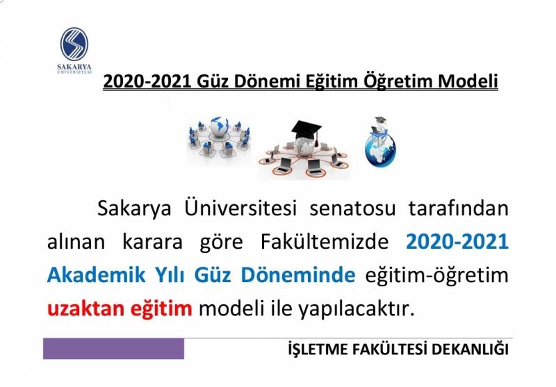 Sakarya Üniversitesi senatosu tarafından alınan karara göre Fakültemizde 2020-2021 Akademik Yılı Güz Döneminde eğitim-öğretim uzaktan eğitim modeli ile yapılacaktır.